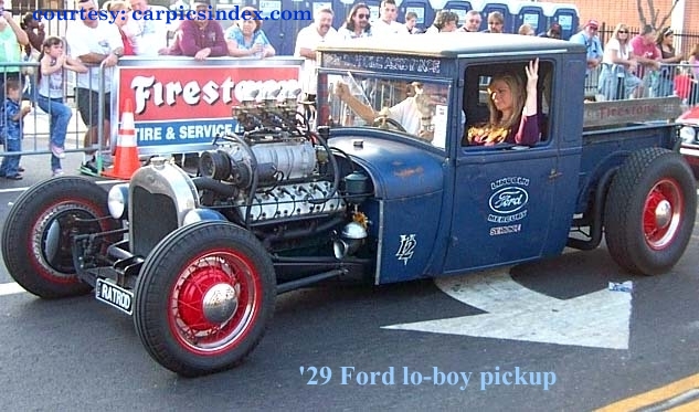 “Hi-boys” and “Lo-boys” refer to fenderless hot rods from the era, which may be chopped (lowered roof) or channeled (lowered body on frame), or both – these two early Fords are good examples, one for show, one possibly a competition dragster.
