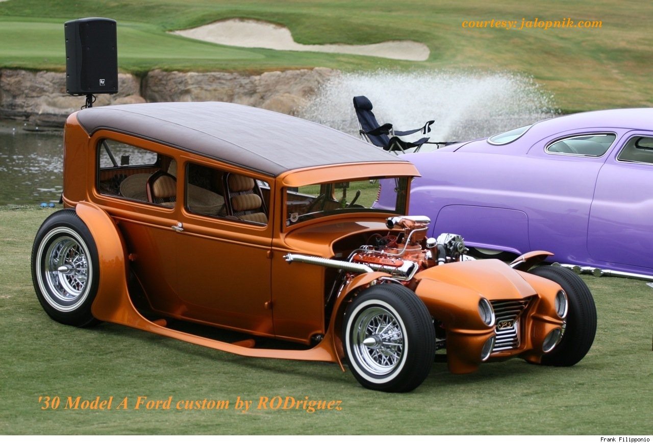 Chevy, Ford, Plymouth — many professional custom car builders, like RODriguez, below (photo credit: Frank Filipponio), have used platforms from early Fords for their creations. Likewise, there are fiberglass or aluminum replica customs from several shops based on early Fords from the thirties, like this ’37 “convertible hardtop” …