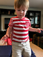 What common experiences will we share? Right now, his world consists mostly of exploring his new-found autonomy and agency — everything is new. He’s fascinated by all of it, but certain behaviors have longer-lasting appeal, it seems. He loves placing things in containers, and tries endless combinations of different things being placed in the same container. He also assiduously mimics kitchen behavior — “cut, cut” with a plastic knife or fork is downright compulsive. It is always followed by “eat” or “food” o “hot” — among his earliest words. Both parents are die-hard hipster foodies! His mother maintains a vegetable garden … and often works there with him. And, his other grandfather gave him a kitchen play set which has been sitting in the dining room since before he could stand at its mock sink and oven. Now he prepares full meals there – placing pots on burners (“hot”), offering plates of fake soft pillow fruits and vegetables to his guests (“eat”, “food”).