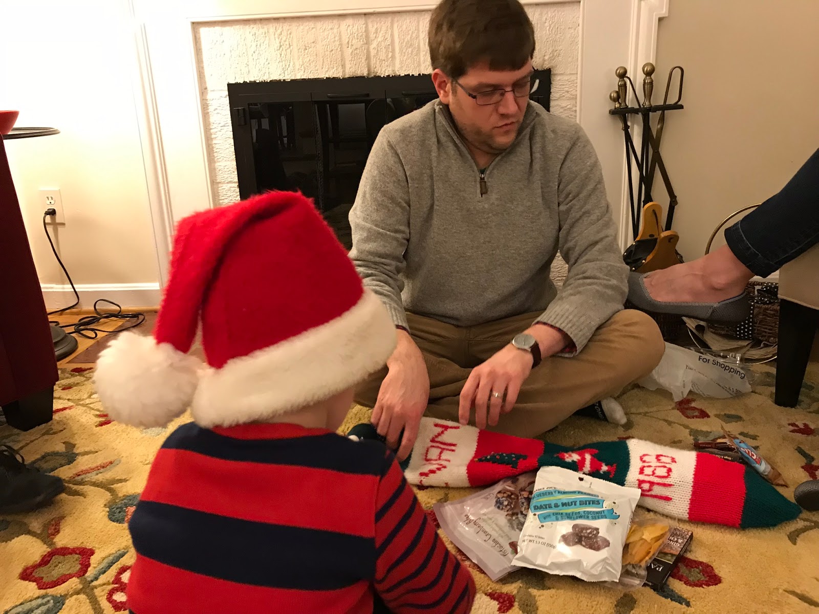 Son and daughter-in-law have decreed that Christmas morning will be at their house, including presents for Owen and baby sister, Mira. Brunch for all. Since the tree at our house is laden with too many presents to reasonably open in one morning, we select a small sample for Owen and Mira, and drive over.
