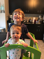They each have their own communication styles: Mira by smiling, grasping, pointing, vocalizing (not quite words yet); Owen by his politeness (“Excuse Me!” when he wants to talk) and questions (“Why?” is the eternal question). Both seem to have an urge to share – stories, experiences, objects, food – and both seem to crave attention from adults, including their grandparents! “Play with me, grandpa!” commands Owen, and outstretched arms from Mira indicate she wants to be removed from her highchair.